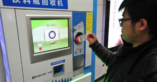 ▼北京捷运站塑胶瓶回收机,塞进空瓶后就能拿到钱。