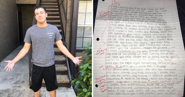 一段感情走到尽头后,很多人不愿意接受,甚至会做出很多傻事去挽回对方。男大生Nick的前女友就给他写了一封超长的道歉信,但Nick没有被感动,反而当成作文批改,然后退了回去。