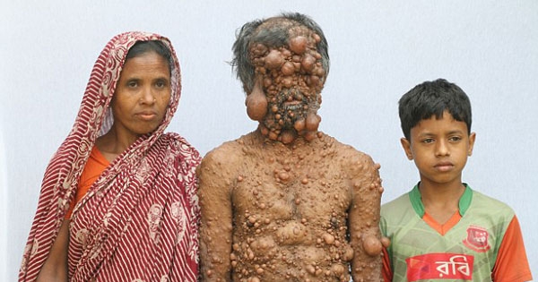 孟加拉国47岁男子Shadot Hossa患有罕见的神经纤维瘤。13岁时,他的额头长出了第一颗肿瘤,但情况不严重,并没有影响他的生活。后来他顺利结婚,还生下了3个小孩。没想到最近5年,肿瘤…