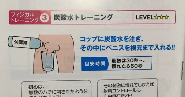 不久前,一名男网友在脸书看到一张从日本流传过来的翻译图片,内容是「用碳酸水泡GG增强性能力」的方法。图片中写道,这是武力训练的一种,难度3颗星,方法很简单,只要将碳酸水倒进杯…