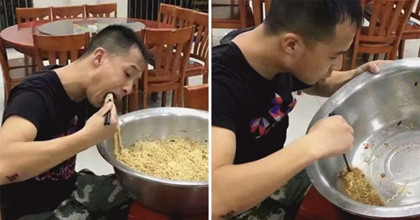 不久前,一张吃麵照片红遍网路。照片中的男子狼吞虎嚥吃完一盆泡麵,连汤都没有放过。