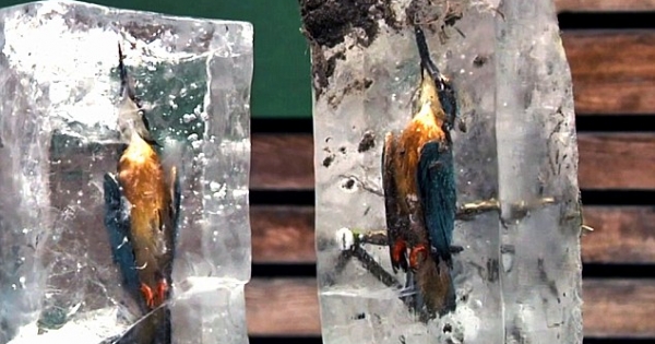 生命的消逝总是令人悲伤,但这两只冲进湖里的捕鱼的翠鸟遭冰封后,却形成了带点诡异又带点美丽的冰砖,彷彿时间停止般被永远的保存了下来!