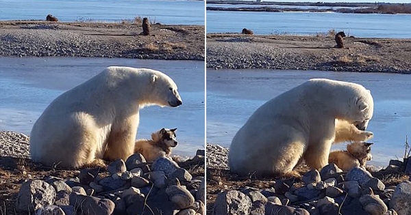 跨物种之间能擦出什幺有趣的火花呢?一位加拿大曼尼托巴省的导游大卫(David De Meulles),就在极地看到了一个极为奇妙的景象,一只北极熊好奇地靠近一只雪橇犬,还伸出牠的掌心,轻轻地…