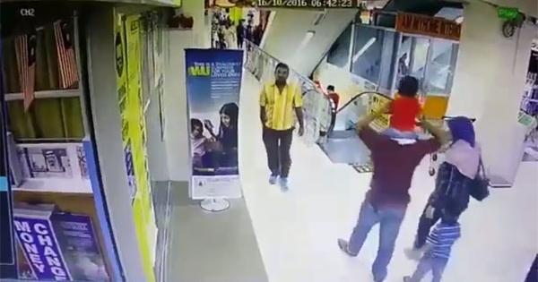 很多爸爸喜欢将孩子扛在肩头,但这样的做法有时非常危险。不久前,马来西亚一间购物中心发生一起意外,一名三岁女孩原本开开心心坐在爸爸的肩膀上,搭乘电扶梯时却突然坠落,跌落在地…