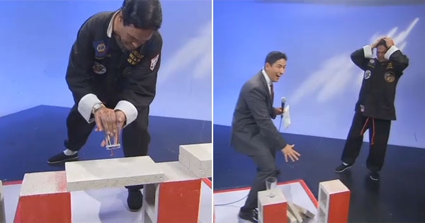 观看空手道高手表演时,我们最常见到的项目就是击破木板和砖块。下面这位「高手」就参加电视节目展示自己的超强能力。