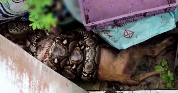 蛇类是相当令人畏惧的肉食动物,由于牠们的颚部能做广角度的开合,往往可以不费吹灰之力就吃下比牠大的猎物。近日,一名泰国的年轻女子就在起床下楼时,发现家中的宠物狗被闯入的蟒…