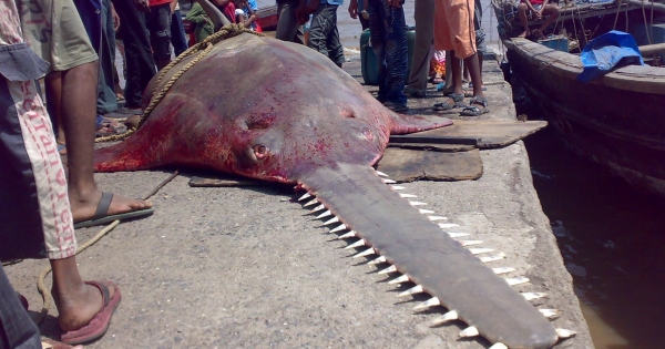 广阔的大海中生物丰富,其中一些很少出现在人们面前。不久前,国外一名渔民捕获了一只奇怪的鱼,牠体型庞大,头部还长着带有锯齿的突起物,看起来非常奇怪。