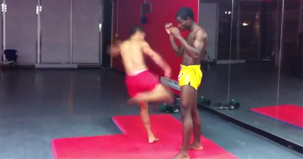 泰拳以腿法着称,攻击性很强。下面这名泰拳教练与学生合作,示範低扫踢动作。这个动作是泰拳搏击中最不起眼的腿法招式,却非常强悍,是泰拳中的品牌武器之一。