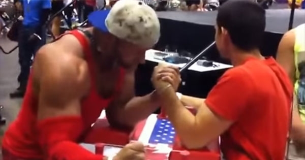 一般来说肌肉越发达的人力量越大,但比腕力时情况可能出现反转。下面这名浑身肌肉的壮汉发现自己比赛的对手是一名小个子后暗暗窃喜,以为一下子就能赢过…