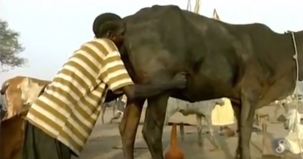 牛在非洲游牧部落中是财富的象徵。因为牛不仅能挤奶,还能卖肉,实在是不可多得的宝贝。当地的人不管男女老少,都对挤奶相当熟悉。而下面这位男子却对着牛的屁股疯狂吹气,是为了什…