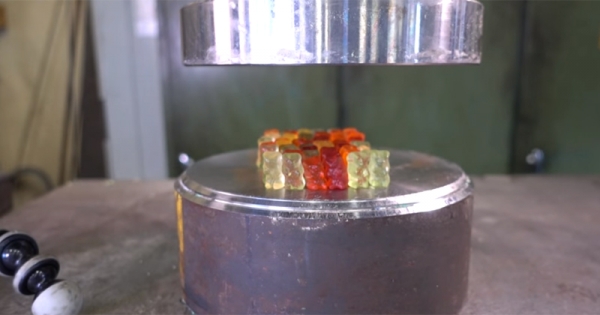 小熊软糖是孩子们的最爱,每次吃这样的糖果,都能感觉到幸福的味道。这次「液压机」试验的目标就是Q弹的小熊软糖。毫无疑问,连金属都能瞬间压坏的液压机自然能够压爆软…