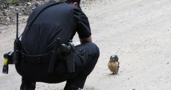 美国科罗拉多州圆石郡(Boulder County)的警察先前在进行例行巡逻时,意外在路中央碰到了一只呆萌的小猫头鹰。牠看到警车跟人不但不急着逃跑,当女警蹲下询问这个小家伙「怎幺了」…