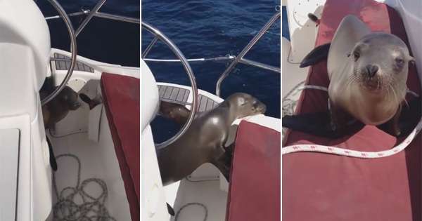 海狮能够在陆地行动,也很擅长游泳。下面这些网友乘船在纽波特海岸附近游玩时,就遇到了一只疲倦的小海狮。牠并不怕人,还主动爬到了船上,想…