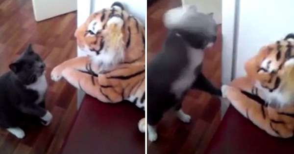 猫咪和老虎虽然同属猫科动物,但单凭外观看就知道不是同等级的,当天生好奇的猫咪遇到老虎,会发生什幺样的事情呢?猫咪会掉头逃跑吗?看看下面这只猫咪的反应吧,肯…