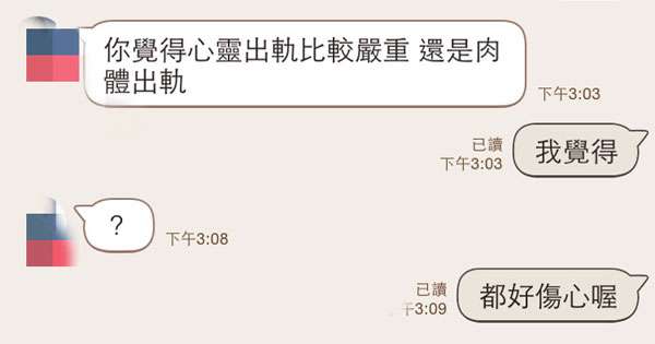 出轨常常是毁灭一段关係的元兇,听到另一半跟你坦承出轨更是心痛难忍的事情。以下这位网友就在上课的时间收到女友的Line,问他觉得精神出轨还是肉体出轨哪个严重,当下他就觉得不…