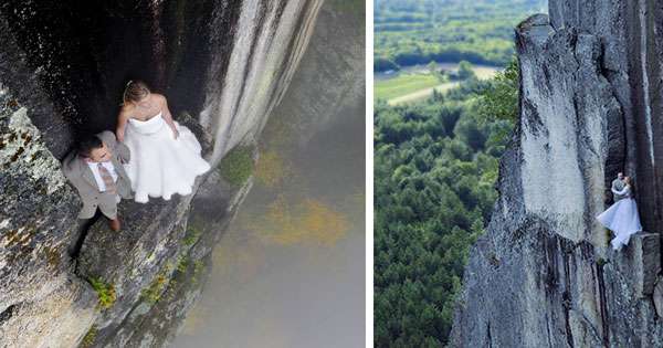 拍摄婚纱照对新人们来说意义重大。摄影师菲尔布里克(Jay Philbrick)希望能够让新人们有终生难忘的体验,他带客户来到国家公园,让他们站到350英尺高的悬崖上拍…