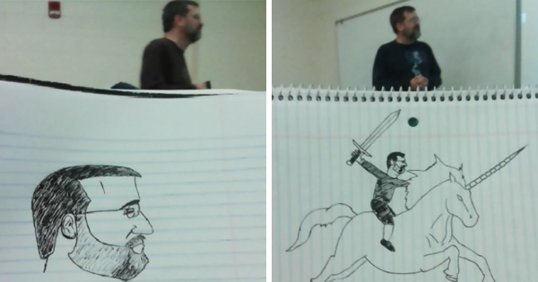 每个人打发时间的方式都不一样。有人会小睡片刻,有人会玩手机,下面这名网友则喜欢涂鸦。他感觉商业管理课的教授讲课太枯燥,所以发挥想像,让他成为了涂鸦的主角。