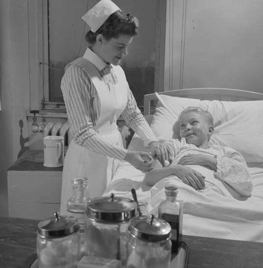 ▼1940年,护士服的围裙越来越轻便,但仍然是以长版的围裙为主,以便可以覆盖护士身穿的长裙。一来可以方便清洗,二来也可以可以避免沾血的围裙传播病毒。